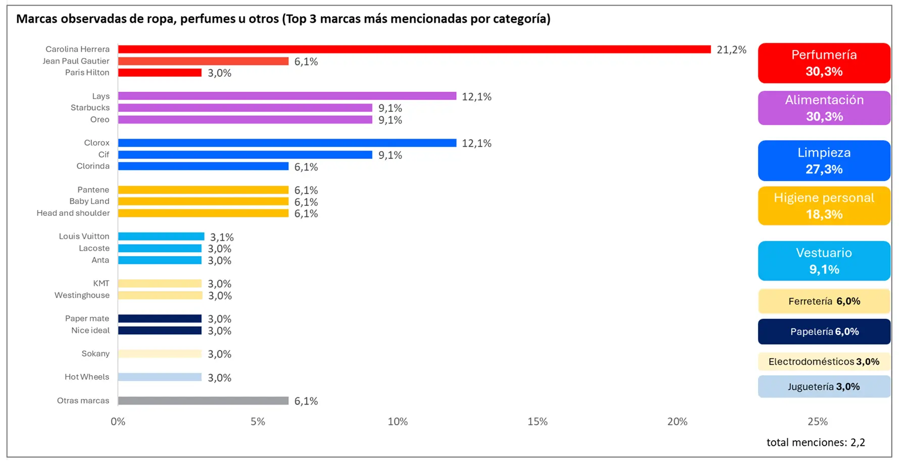 En el Top 3 de categorías con mayor presencia de marcas conocidas se ubican la perfumería (30,3%), seguida de la alimentación (30,3%) y los artículos de limpieza (27,3%). Estas categorías concentran la mayor exposición de marcas reconocidas.