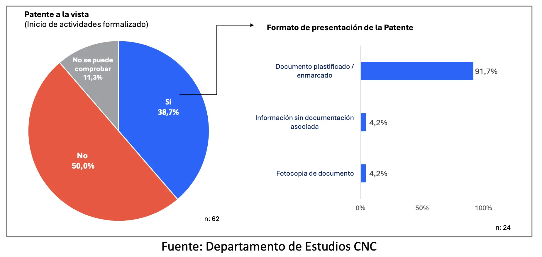 Se observa que solo el 38,7% de los locales presenta patente a la vista, mientras que un 50% no la exhibe y un 11,3% no permite comprobar su existencia. Entre los locales con patente visible, la mayoría muestra una fotocopia plastificada o enmarcada (91,7%). Respecto al Rol Único Tributario (RUT) un 76,3% de los establecimientos lo exhibe, aunque sin garantizar la coincidencia con el nombre del local o la patente.