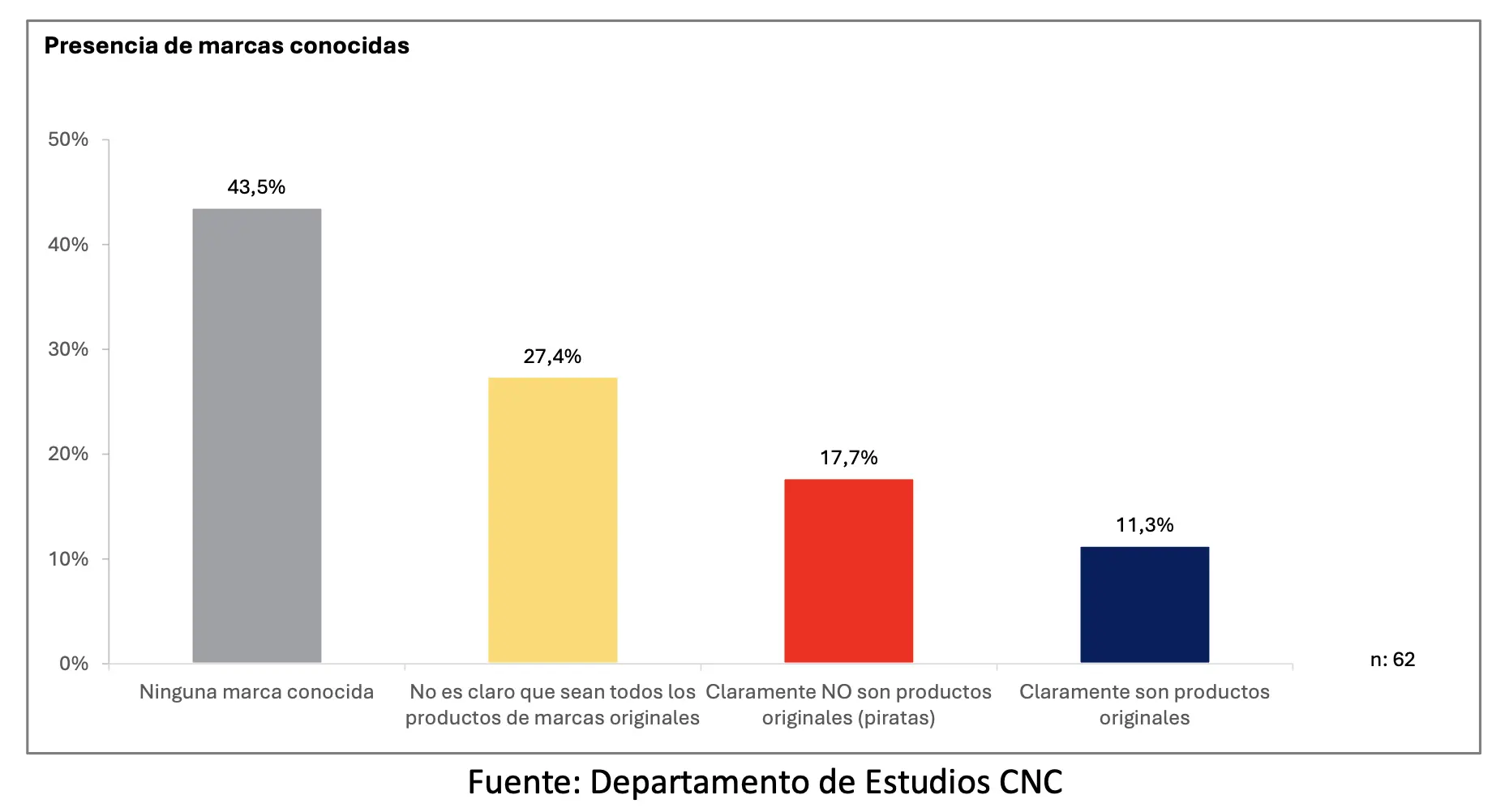 En materia de legalidad, un 43,5% de los locales ofrece en su totalidad productos de marcas desconocidas, mientras que en el resto se puede identificar algunas marcas conocidas. Cuando hay al menos una marca conocida, en un 27,4% de los casos no es claro si se trata de productos originales, en tanto, un 17,7% de locales presenta artículos que claramente no son originales.