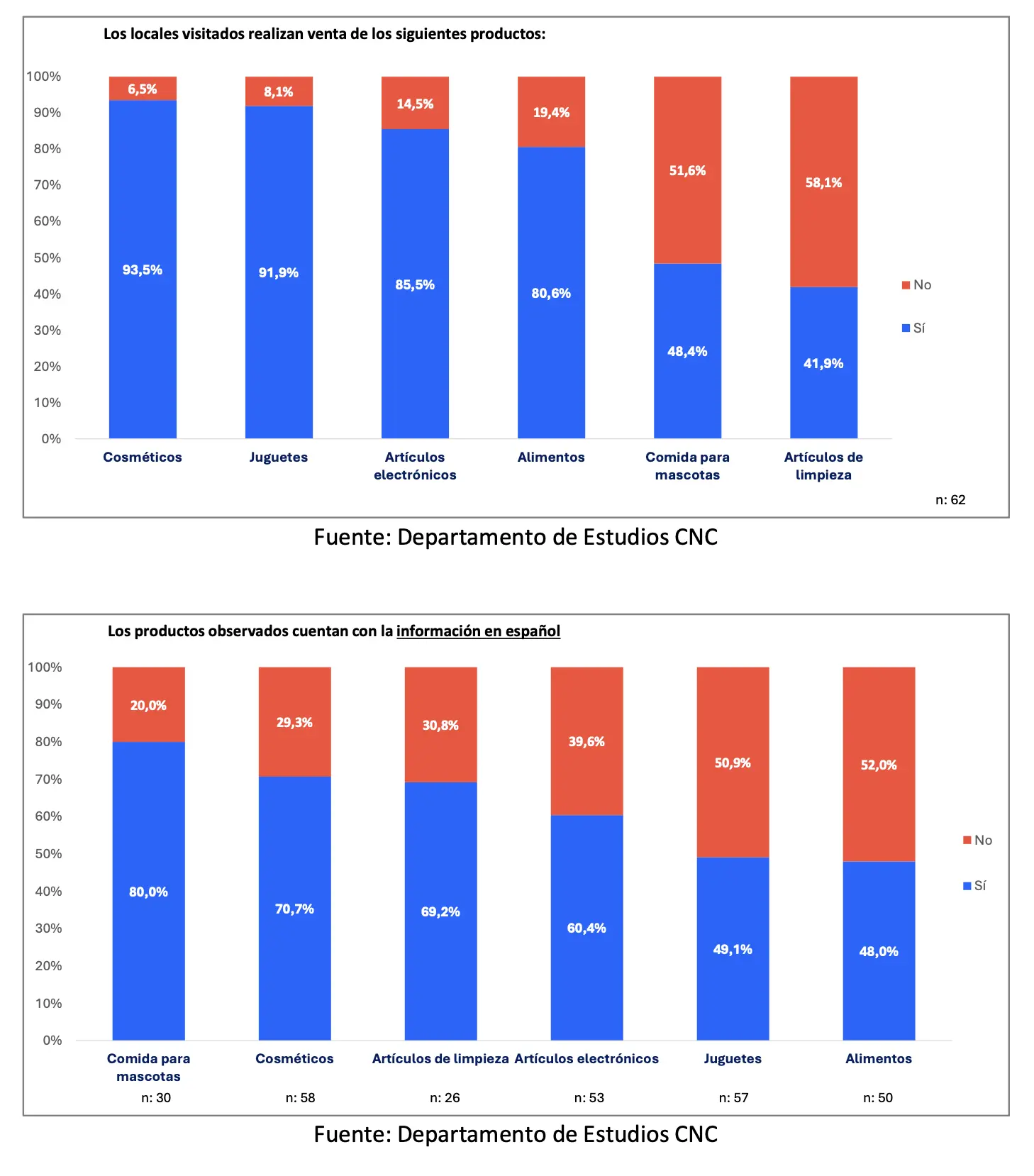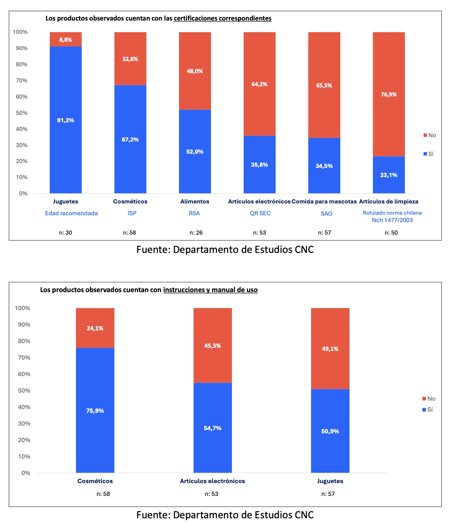 Además, en casi todos los locales se venden productos sensibles como juguetes, cosméticos, artículos electrónicos y alimentos sin cumplir muchas veces los estándares mínimos de información al consumidor: Juguetes: el 91,9% de los locales los comercializa, pero solo el 49% presenta información en español. Artículos electrónicos: el 85,5% los vende, pero solo el 35,8% cuenta con código QR SEC y un 45,3% carece de instrucciones. Cosméticos: presentes en el 93,5% de los locales; solo el 67% tiene certificación ISP. Alimentos: el 80,6% los comercializa, pero solo el 52% exhibe resolución sanitaria. Artículos de limpieza: apenas el 23% cumple la norma chilena NCh 1477/2003. Alimentos para mascotas: solo el 34,5% cuenta con sello SAG.
