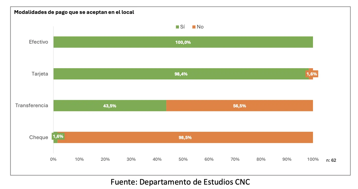 El efectivo es el medio de pago universal en los malls chinos, aceptado en el 100% de los locales observados, seguido muy de cerca por las tarjetas de débito o crédito, aceptada en el 98,4% de los locales observados, lo que confirma una alta penetración de sistemas electrónicos, aunque muchas veces sin trazabilidad tributaria efectiva. Por su parte, poco menos de la mitad (43,5%) acepta transferencias bancarias y el uso de cheques es prácticamente inexistente (1,6%).