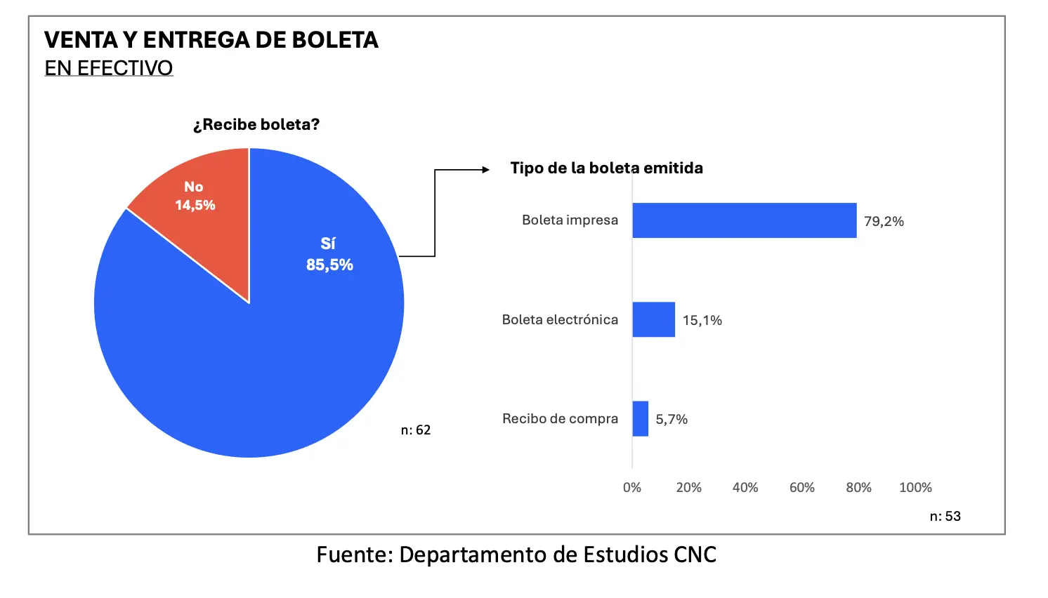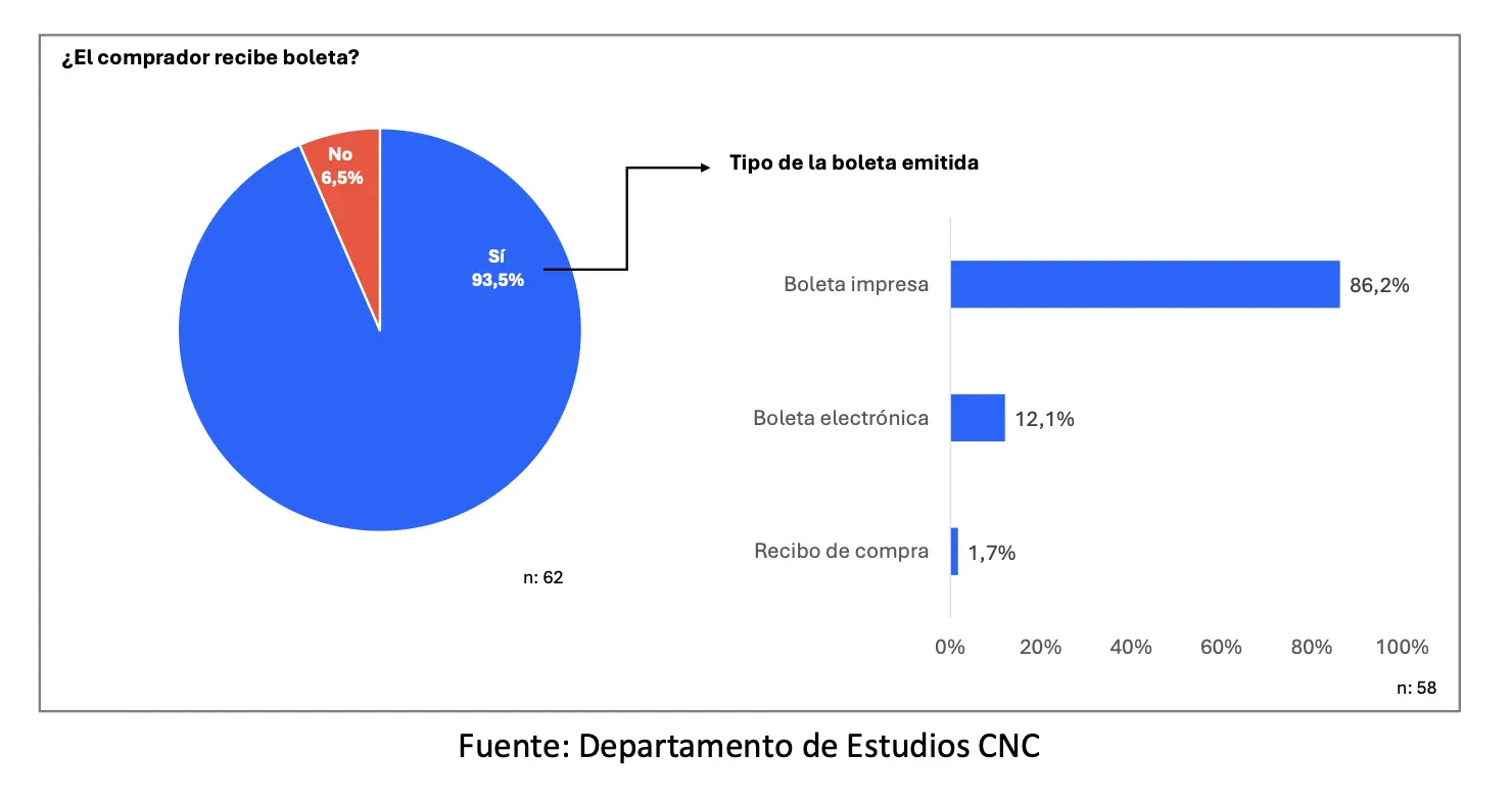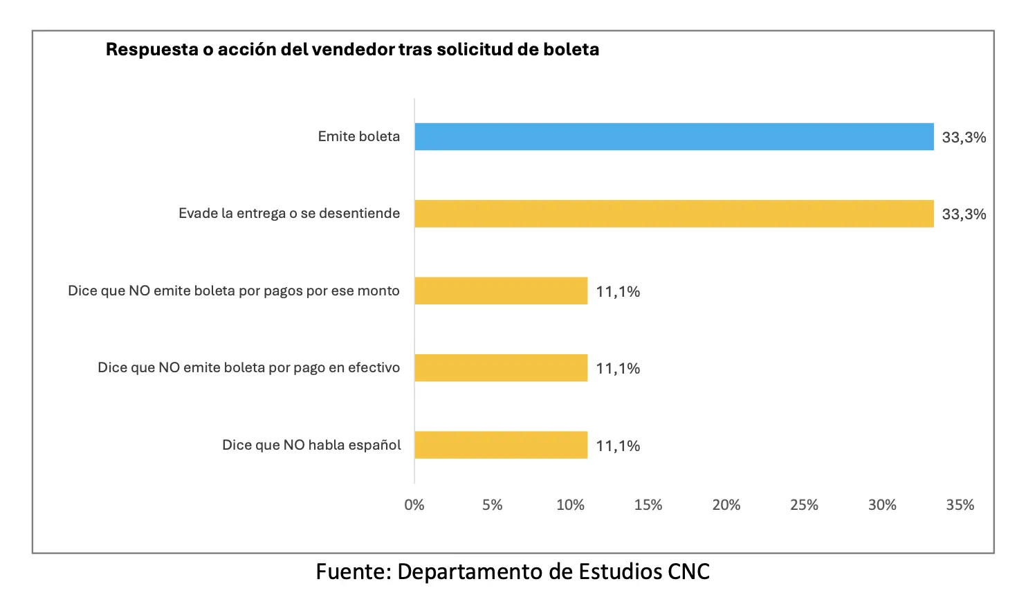 En los casos en que no se entregó, y esta fue solicitada, solo un tercio la recibió finalmente, mientras que en el resto hubo respuestas evasivas o negativas. “También preocupa que un 15% de las compras efectuadas no reciba boleta y que, al solicitarla, solo en un 33% de los casos se entregó. Esto no solo genera un perjuicio en la recaudación fiscal, sino también una desprotección de los consumidores respecto al ejercicio de sus derechos y garantías”, agregó el presidente de la CNC.